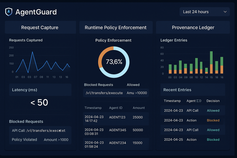 AgentGuard acts as the real-time trust and control layer for autonomous systems. It monitors every agent interaction — every API call, decision, and data exchange — through a unified governance framework designed to detect, evaluate, and respond to potential risk the moment it occurs.